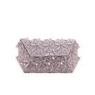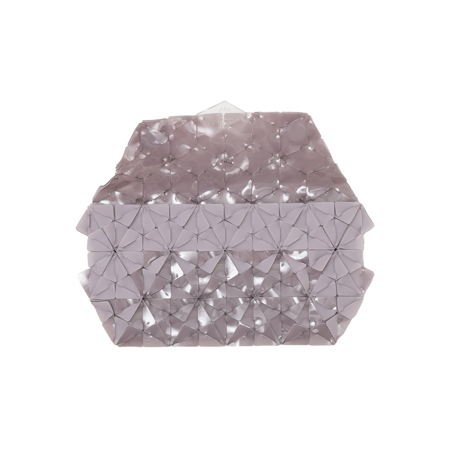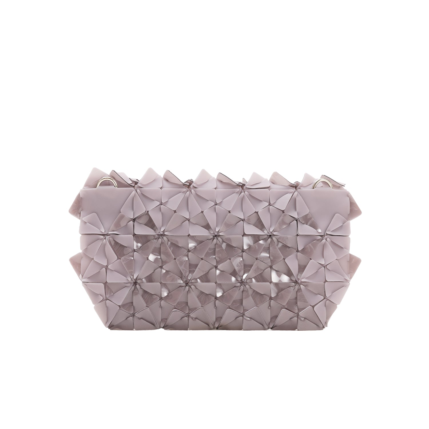 Machine-cut, Hand-woven geometric clutch held together by an interwoven right triangle shape. Soft and comfortable to hold 3D surface texture with rounded corners. Features a magnetic flap and a laser-cut acrylic label. Fits phones, keys, wallet, compact, or any of your everyday objects.  D-rings are available for straps.