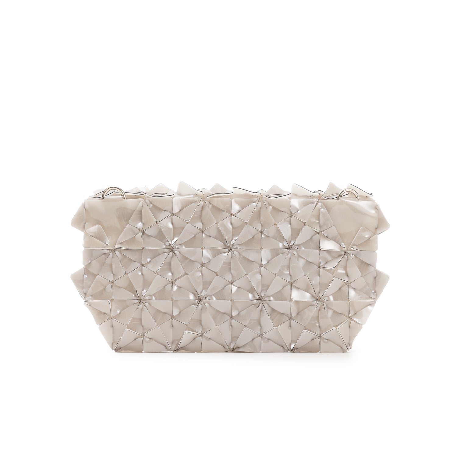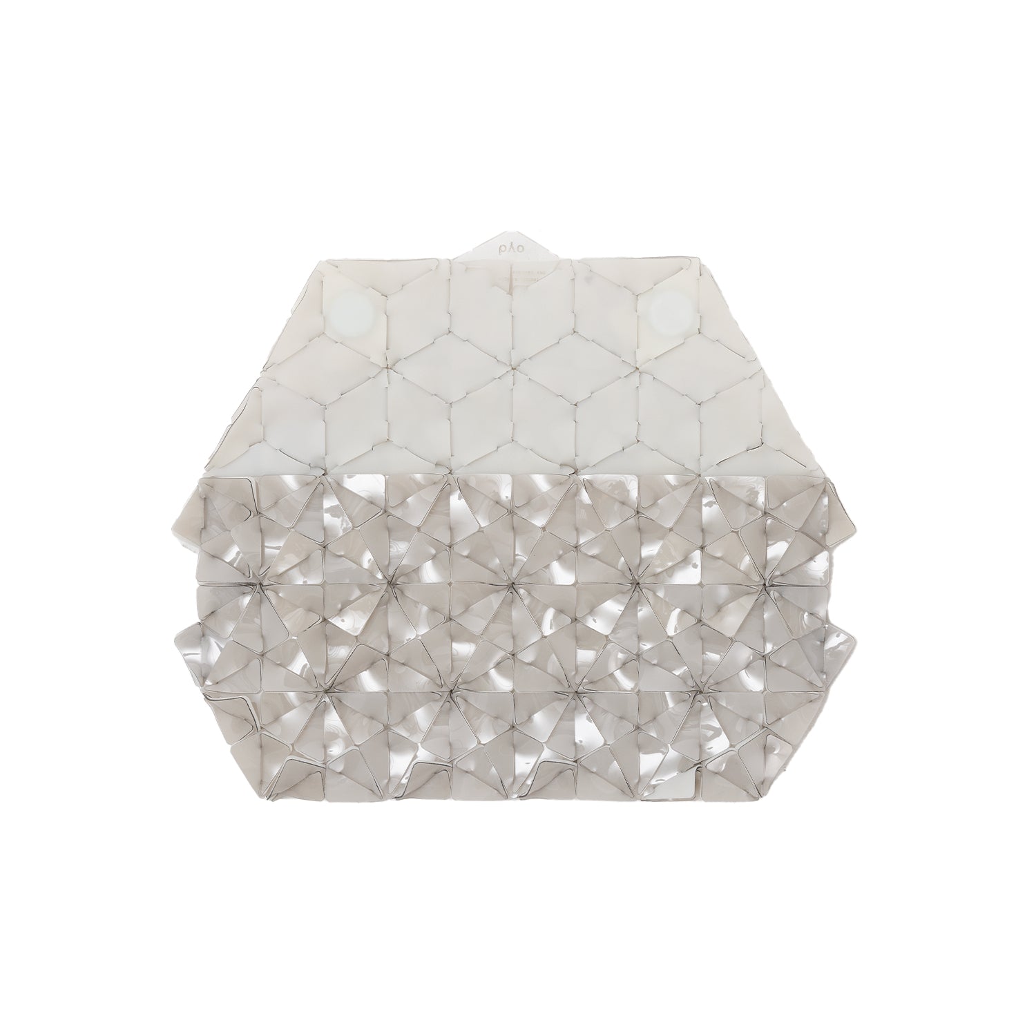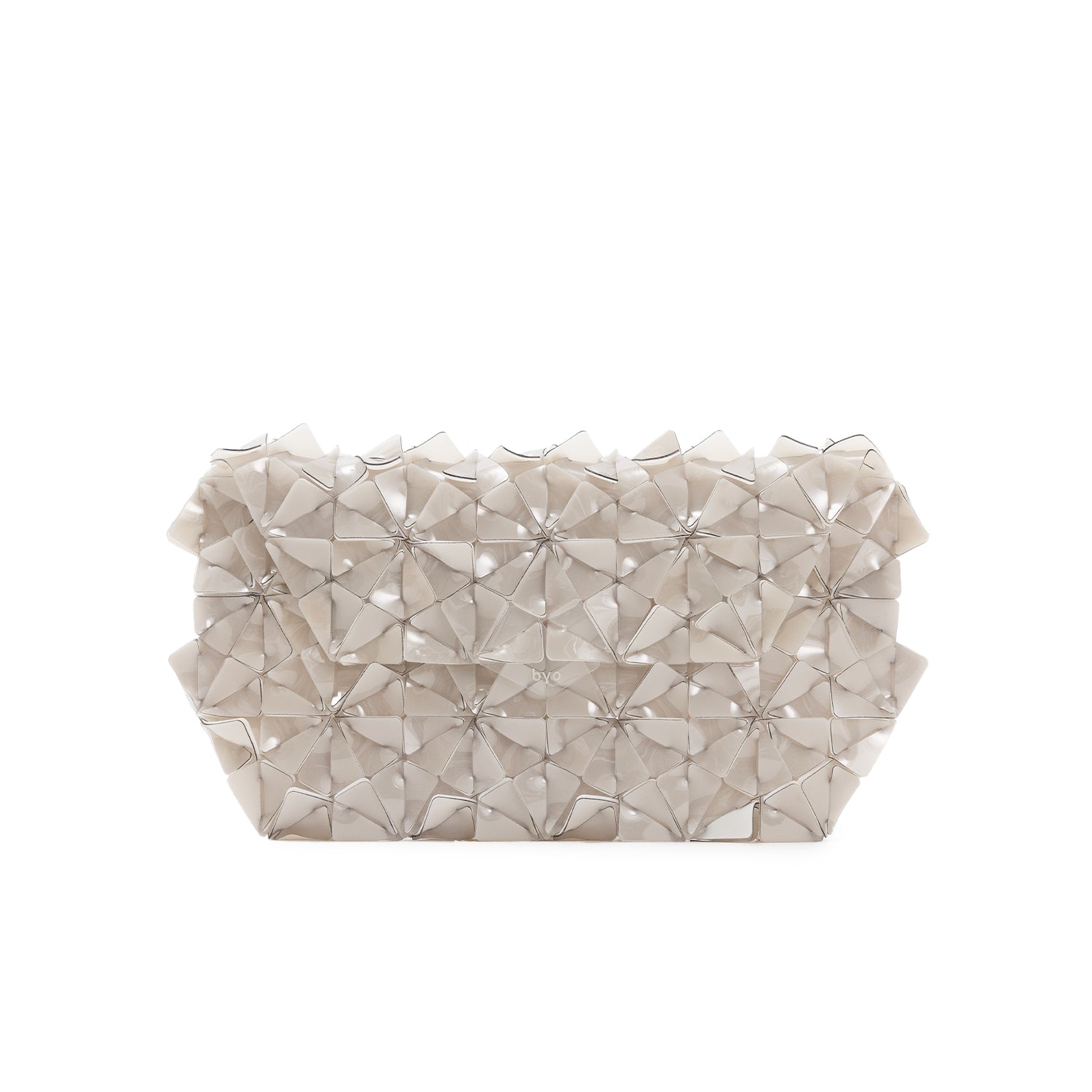 Machine-cut, Hand-woven geometric clutch held together by an interwoven right triangle shape. Soft and comfortable to hold 3D surface texture with rounded corners. Features a magnetic flap and a laser-cut acrylic label. Fits phones, keys, wallet, compact, or any of your everyday objects.  D-rings are available for straps.