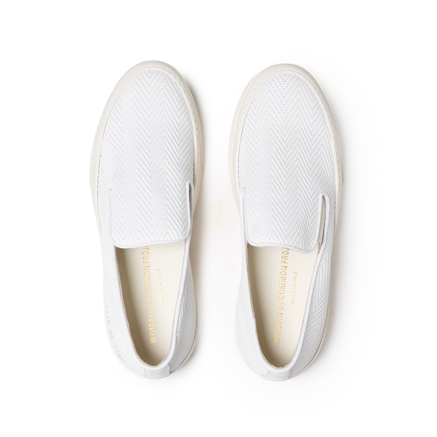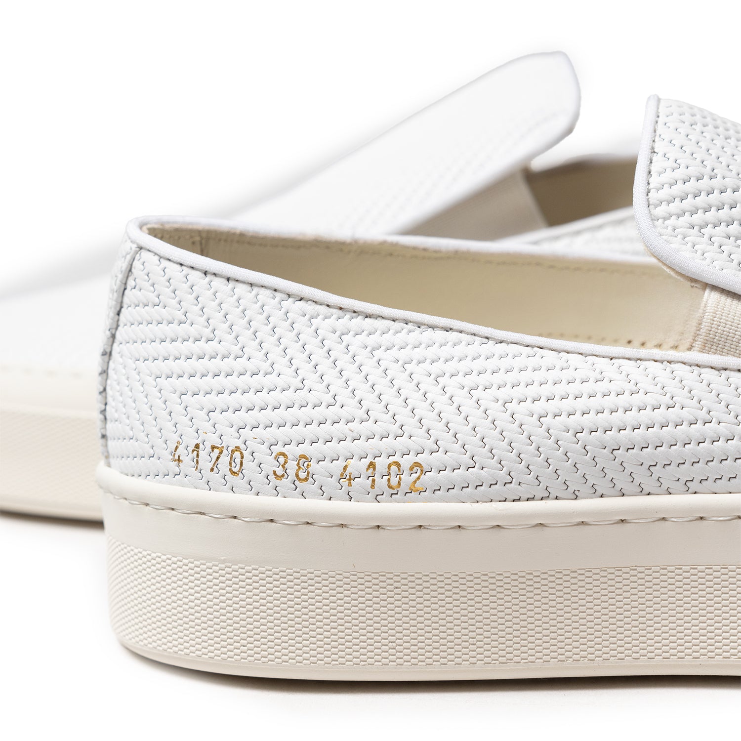 Crafted from supple white leather, this slip-on pair is accented with signature gold serial numbers andd basket weave detailing, adding a touch of sophistication. Make these sneakers a part of your rotation for a casual and stylish look.