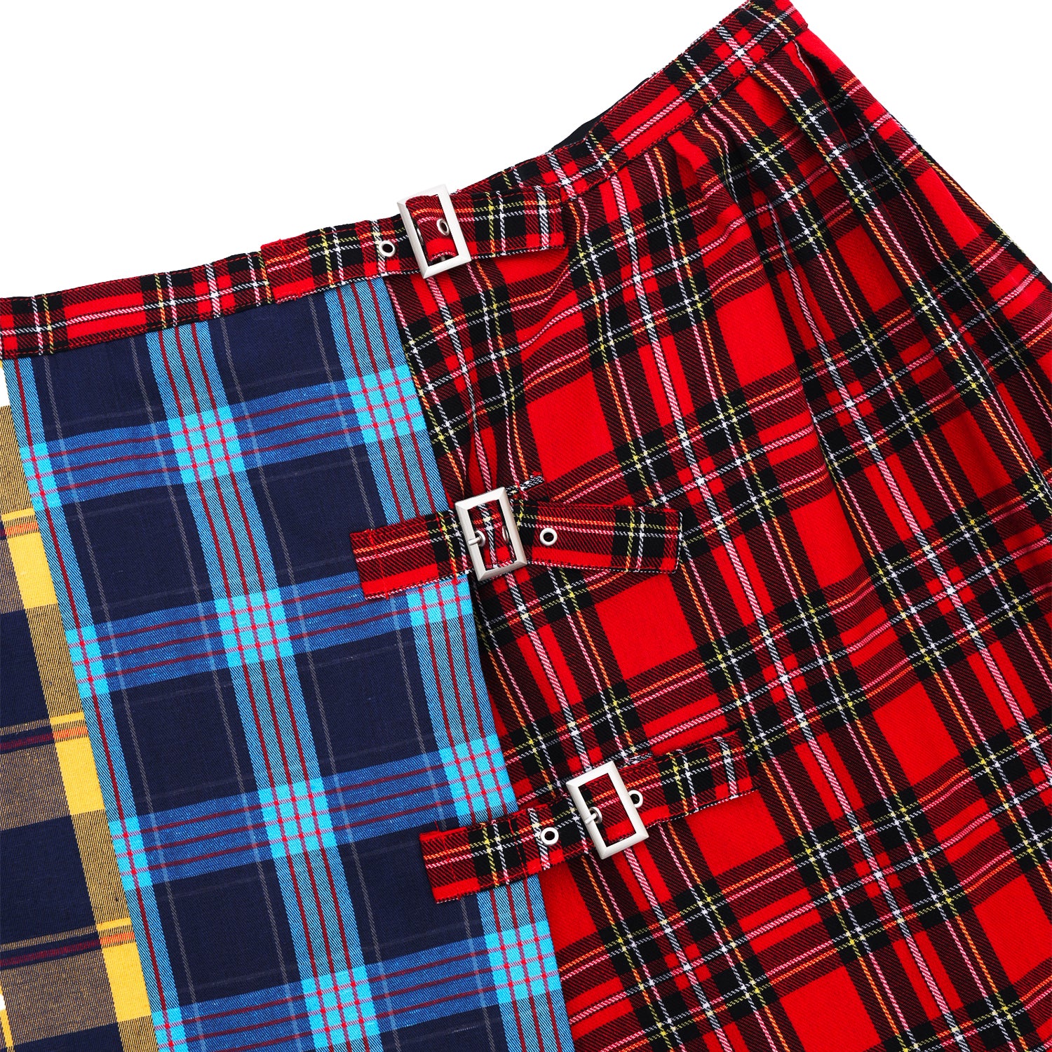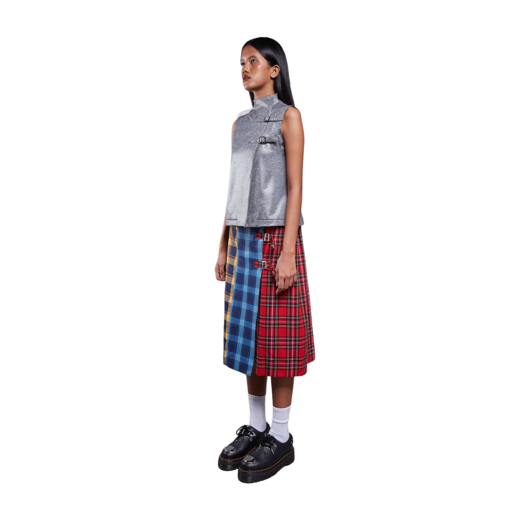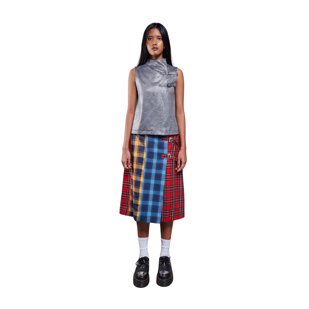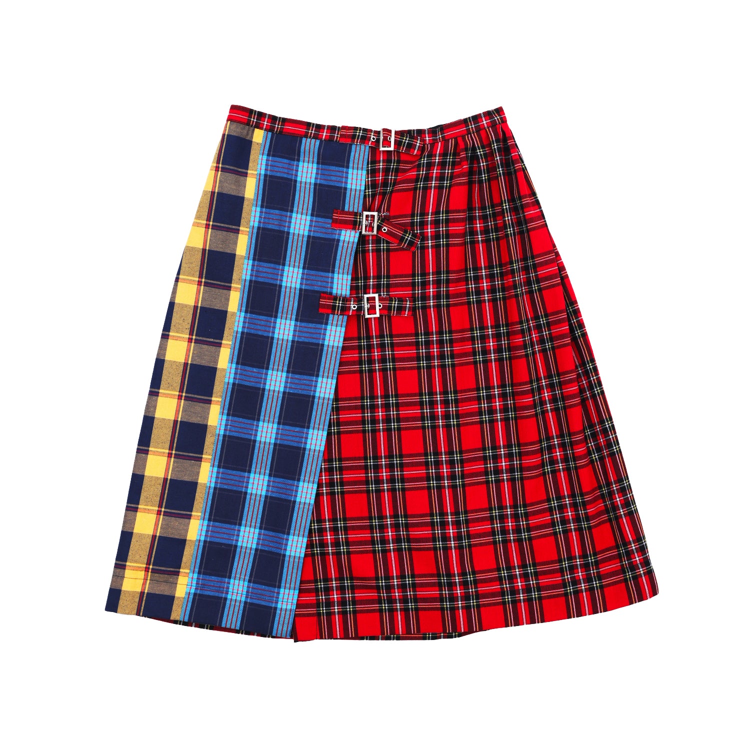 Midi skirt crafted from Japanese cotton in a multicolor plaid pattern. Equipped with three adjustable side buckles allowing for a customizable silhouette.