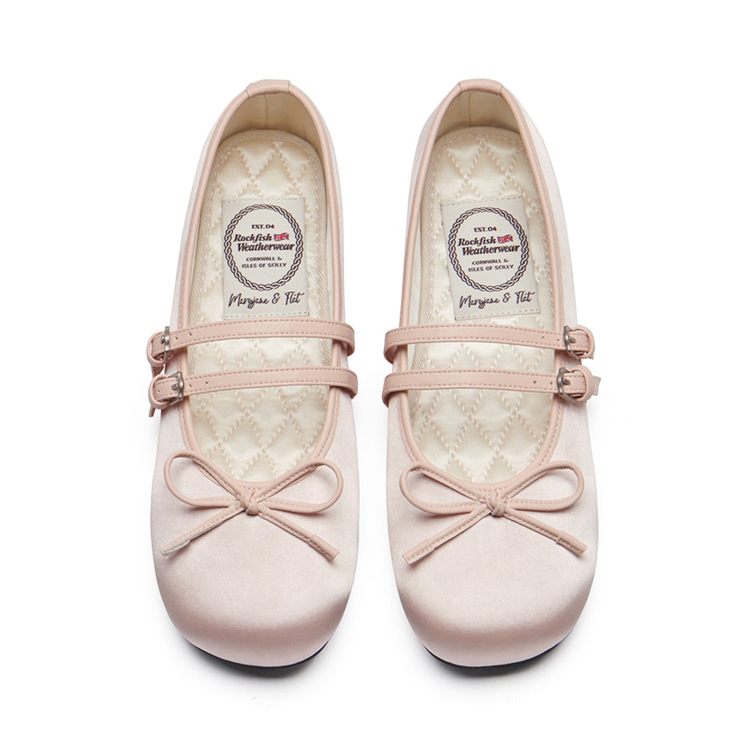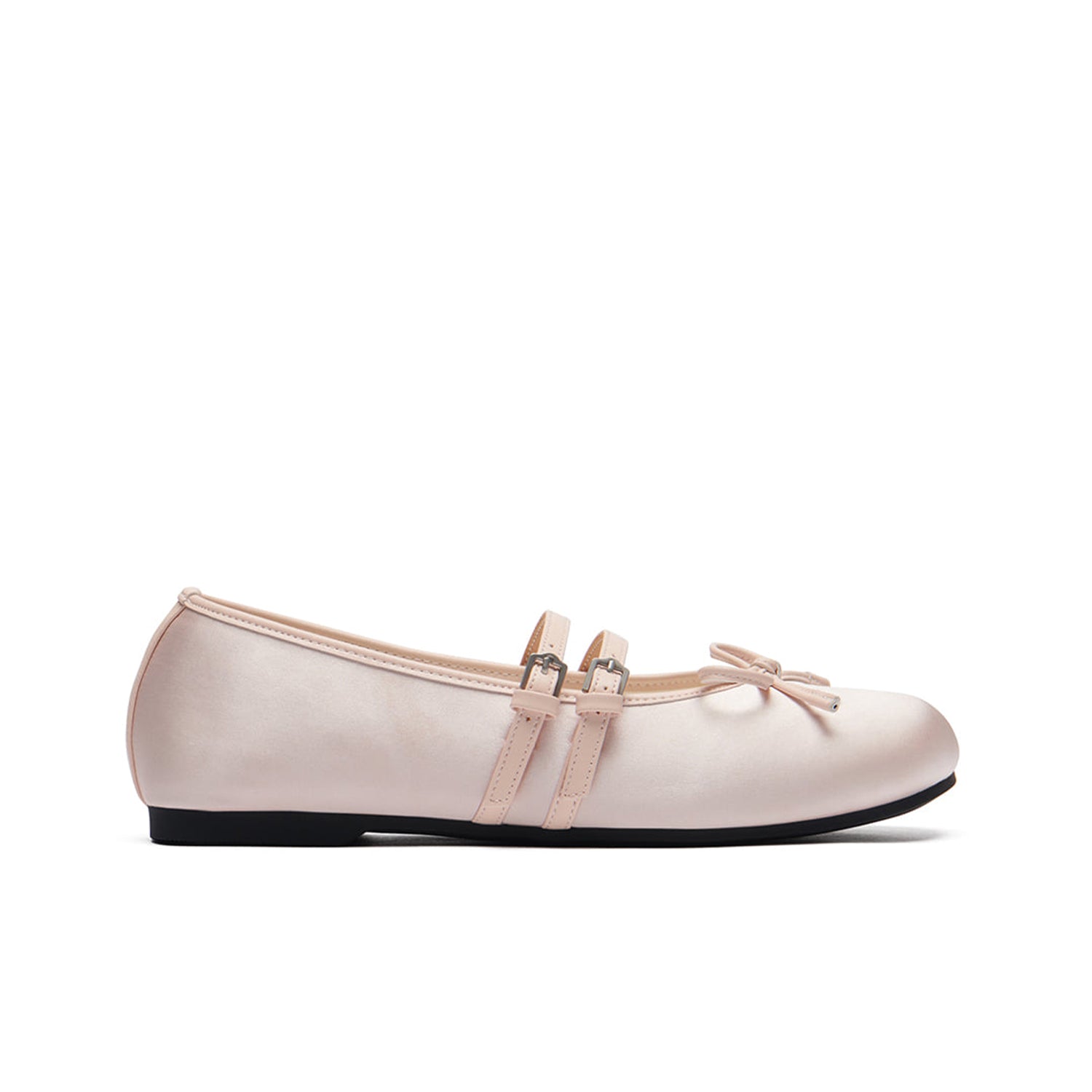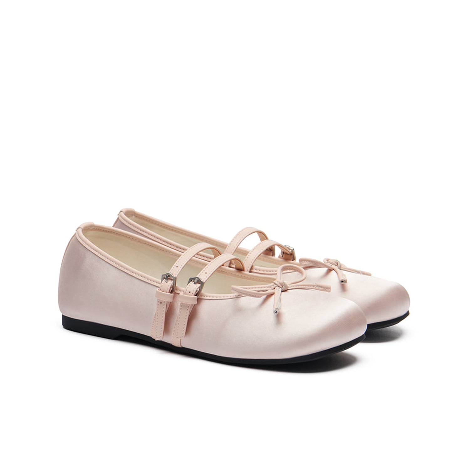 Mary Janes featuring a satin material with a subtle sheen and a square toe shape. The ribbon detail on the instep adds elegance and sophistication, and the slim two straps provide a stable fit.