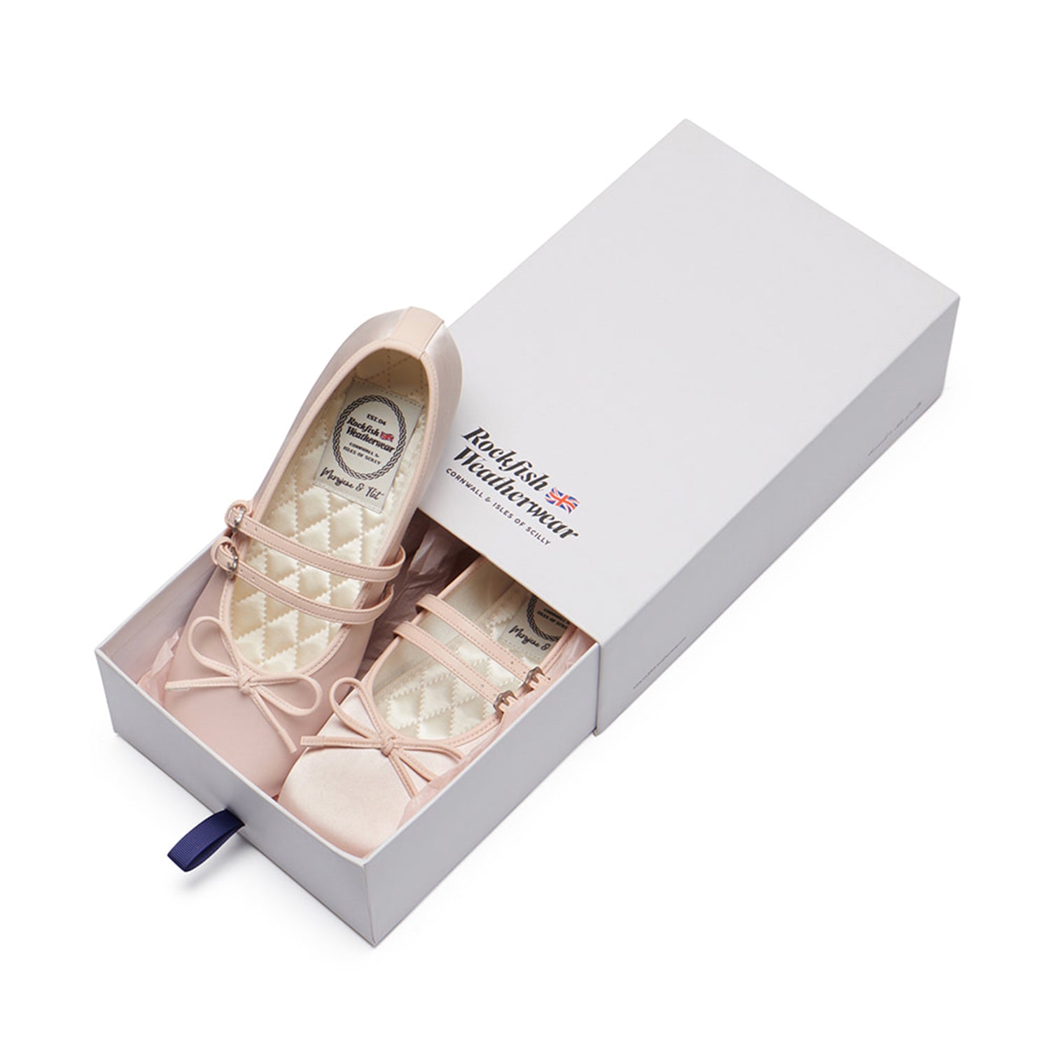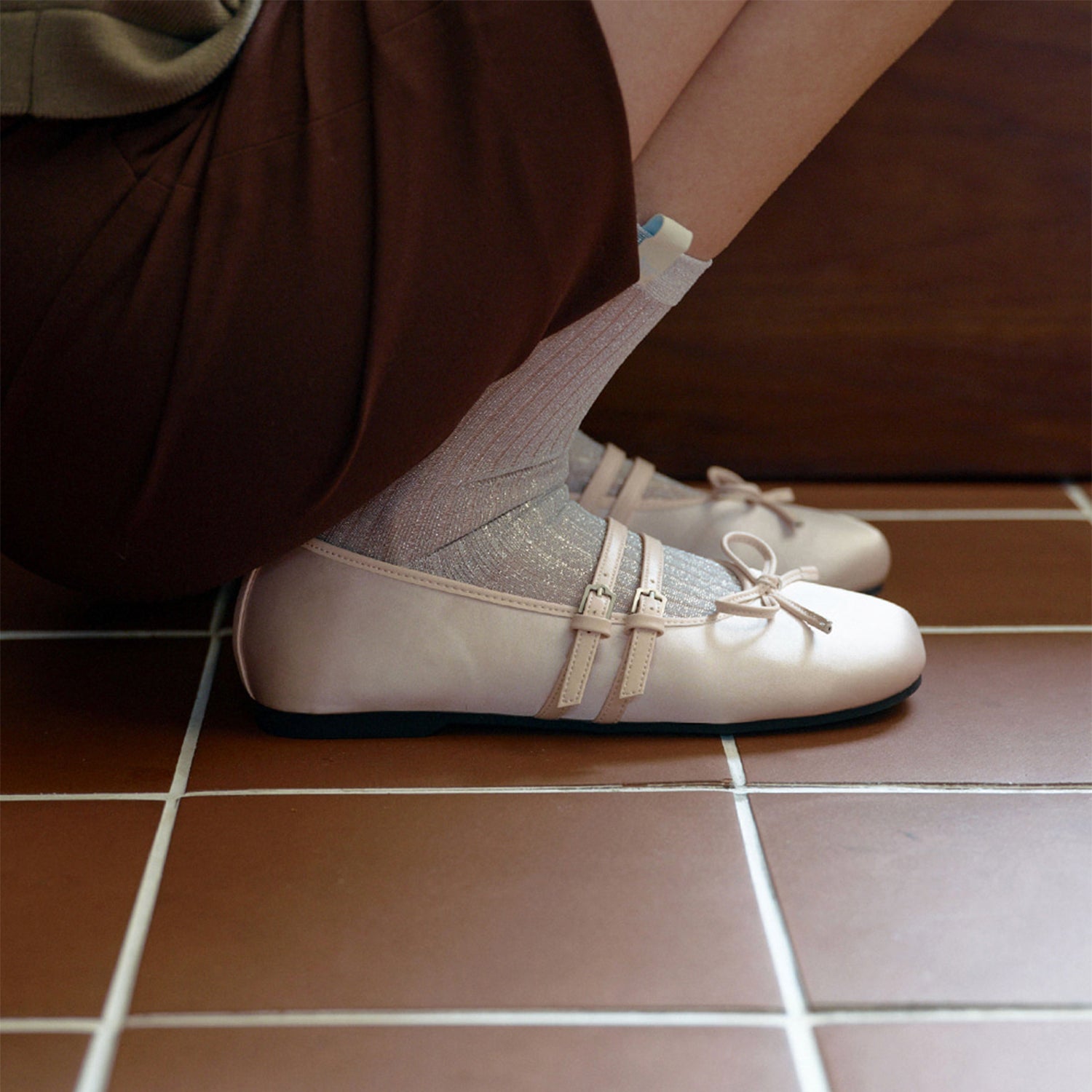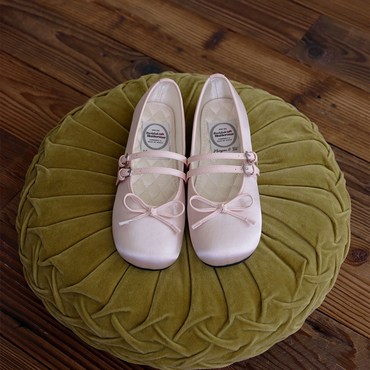 Mary Janes featuring a satin material with a subtle sheen and a square toe shape. The ribbon detail on the instep adds elegance and sophistication, and the slim two straps provide a stable fit.