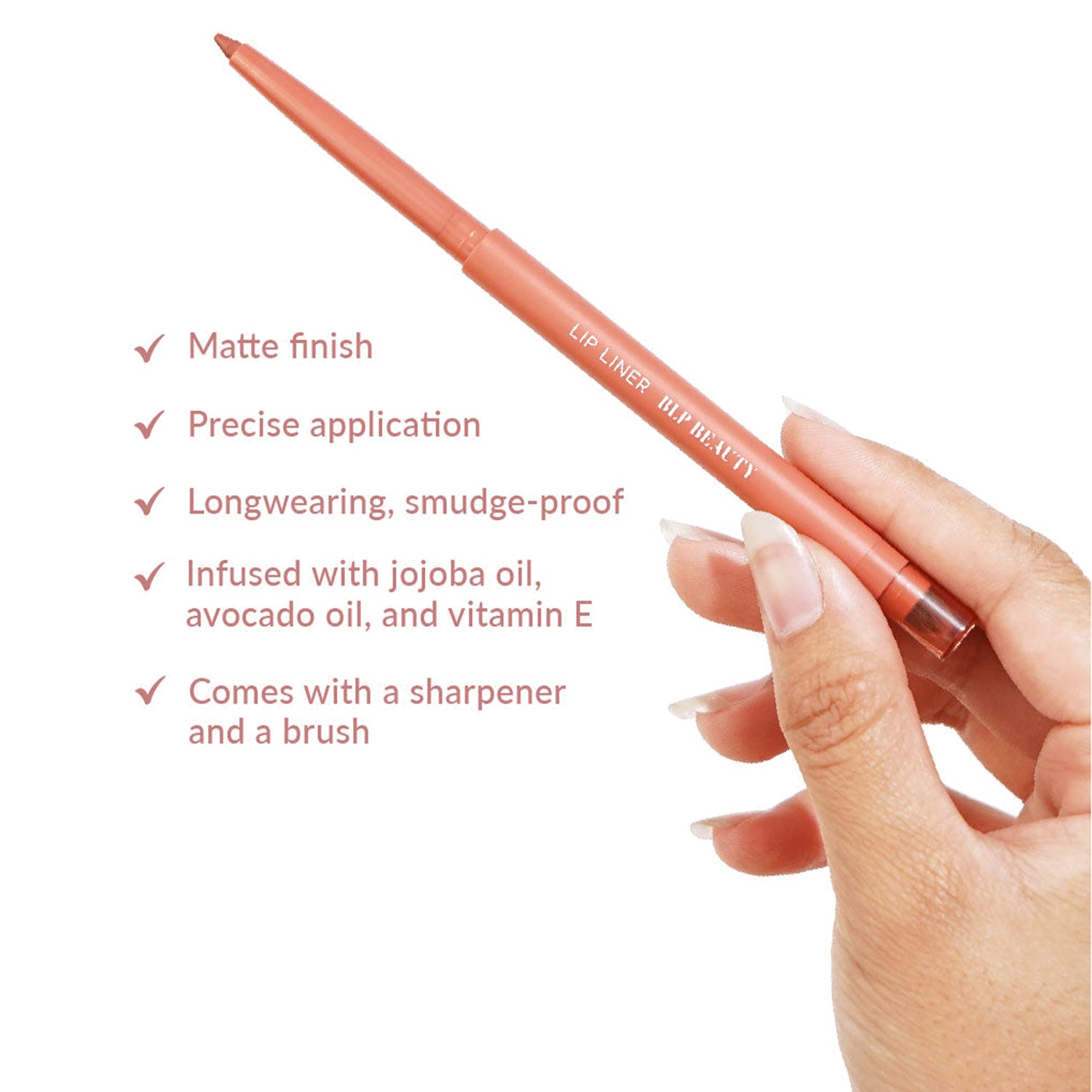 Lip Liner is a must-have matte liner to line, define, and shape your lips with precision. Its pigmented, smudge-proof formula helps prevent feathering while maintaining your lined lips’ shape throughout the day. Infused with jojoba oil, avocado oil, and vitamin E for extra comfort, Lip Liner also comes with a built-in brush and sharpener for hassle-free application. Wear it alone or pair with Lip Vinyl for the most luscious lips ever!