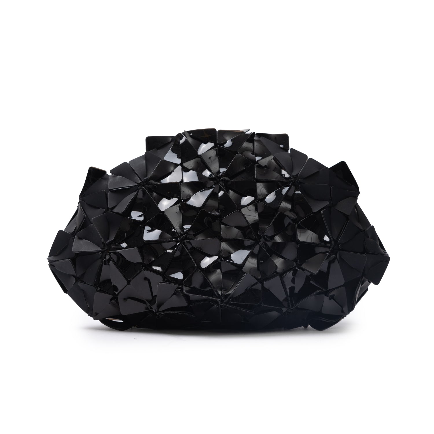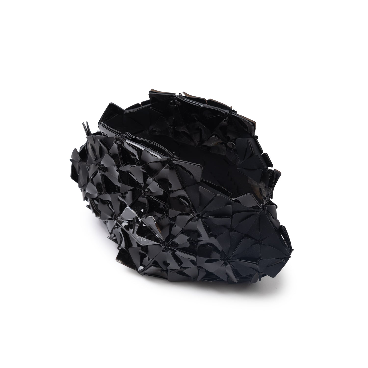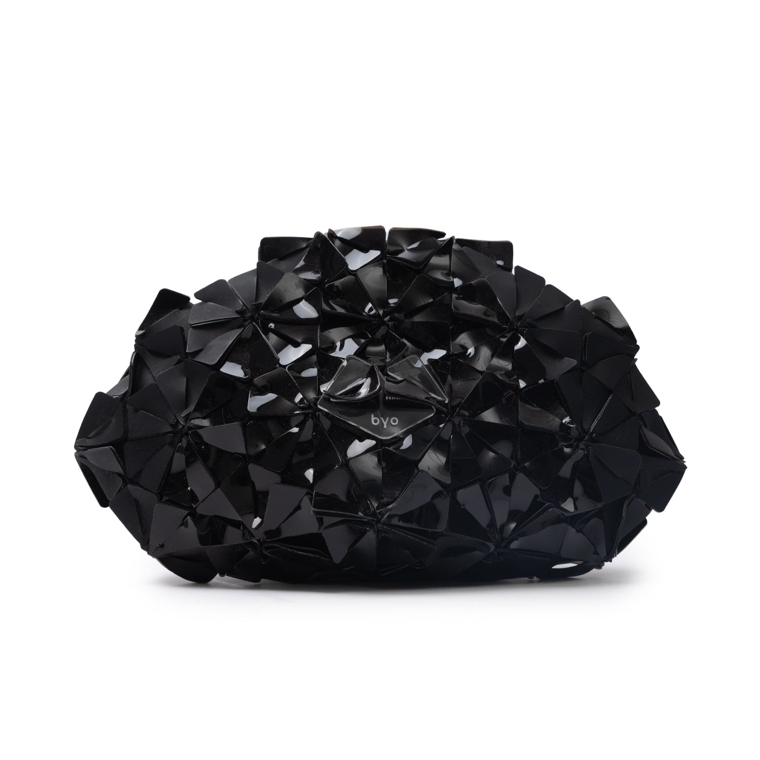 Woven clutch bag with a compact size specifically designed as a party bag. Made from a combination of shiny PVC and latex for a futuristic and avant-garde effect. Can fit smartphones and lipstick. Features a magnetic closure and laser-cut branding details. Length dimensions: 25 cm, width 15 cm, thickness 11.5 cm