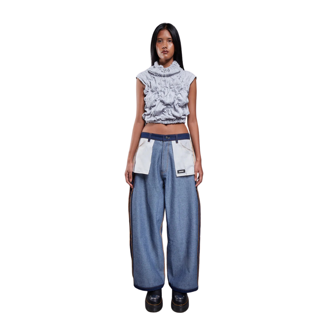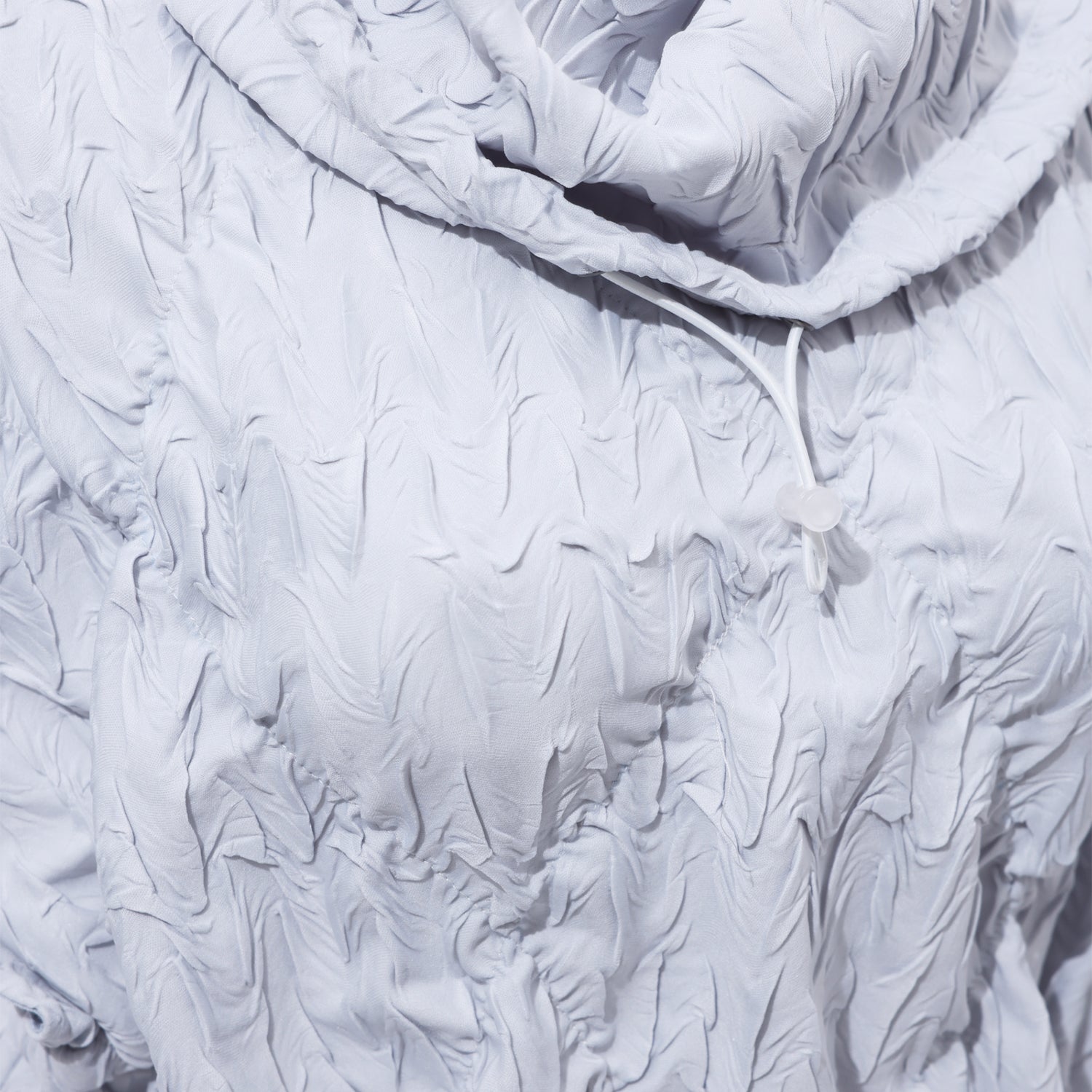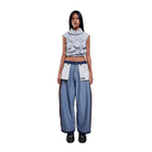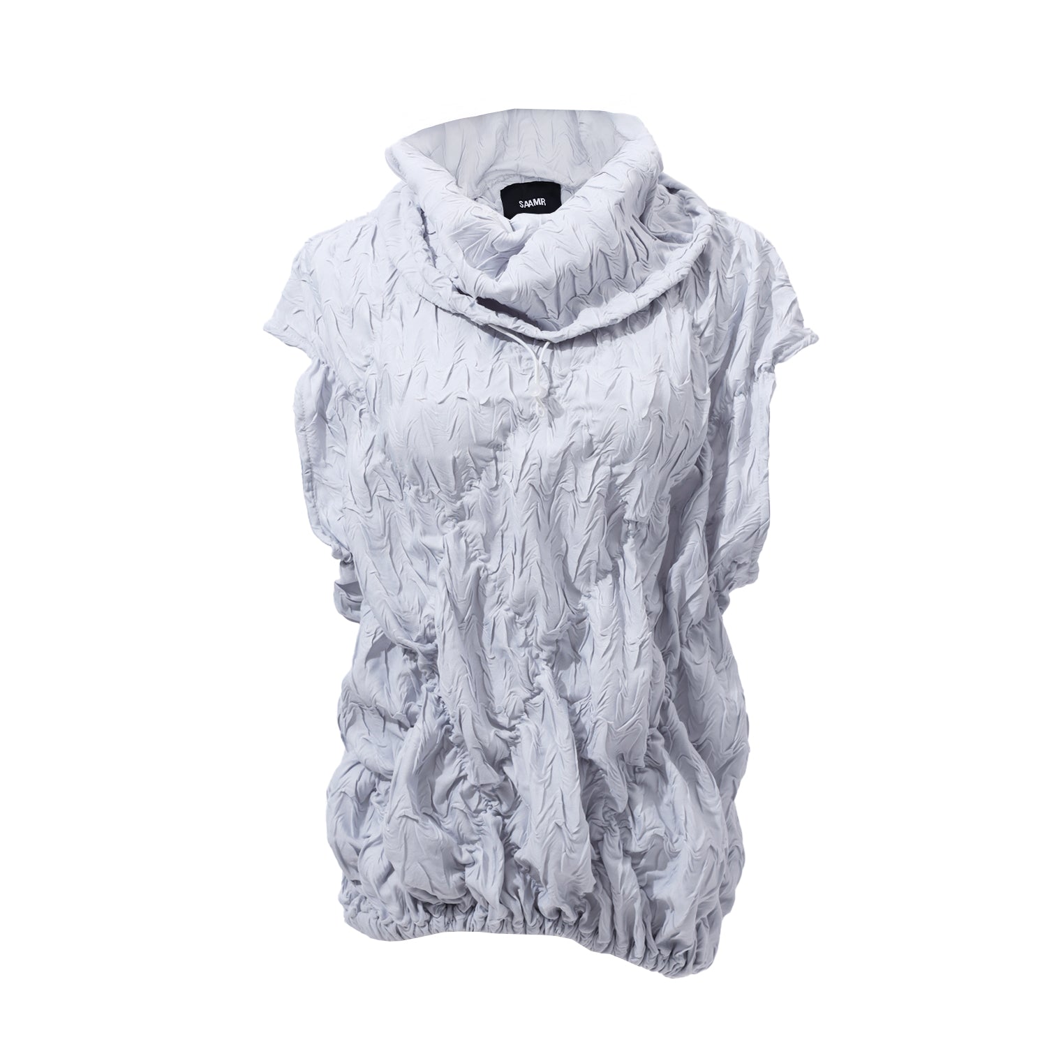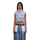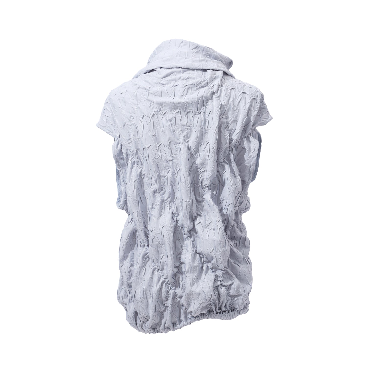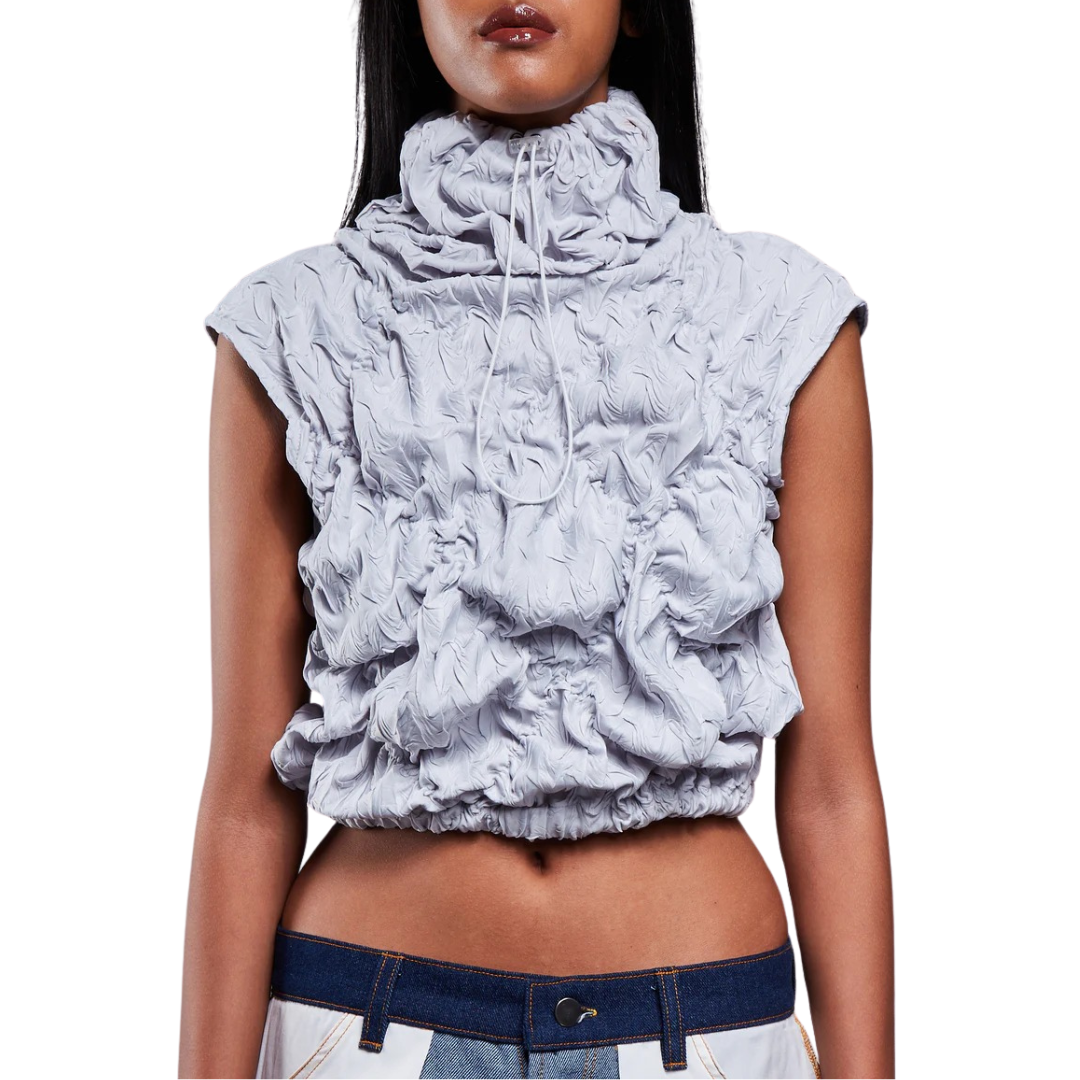 Sleeveless top with cowl neckline in grey denier 70 featuring elasticated waistband against the textured fabric.