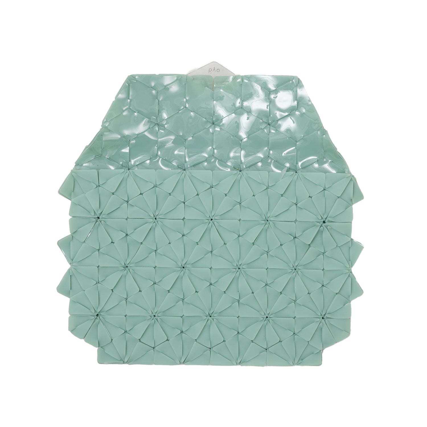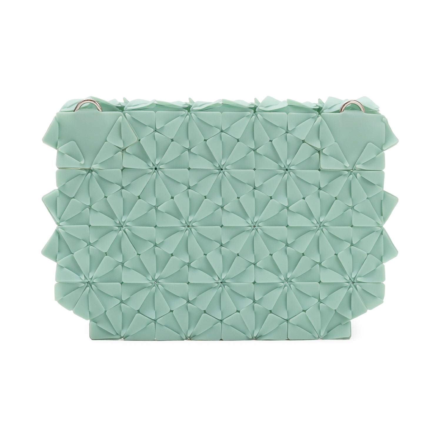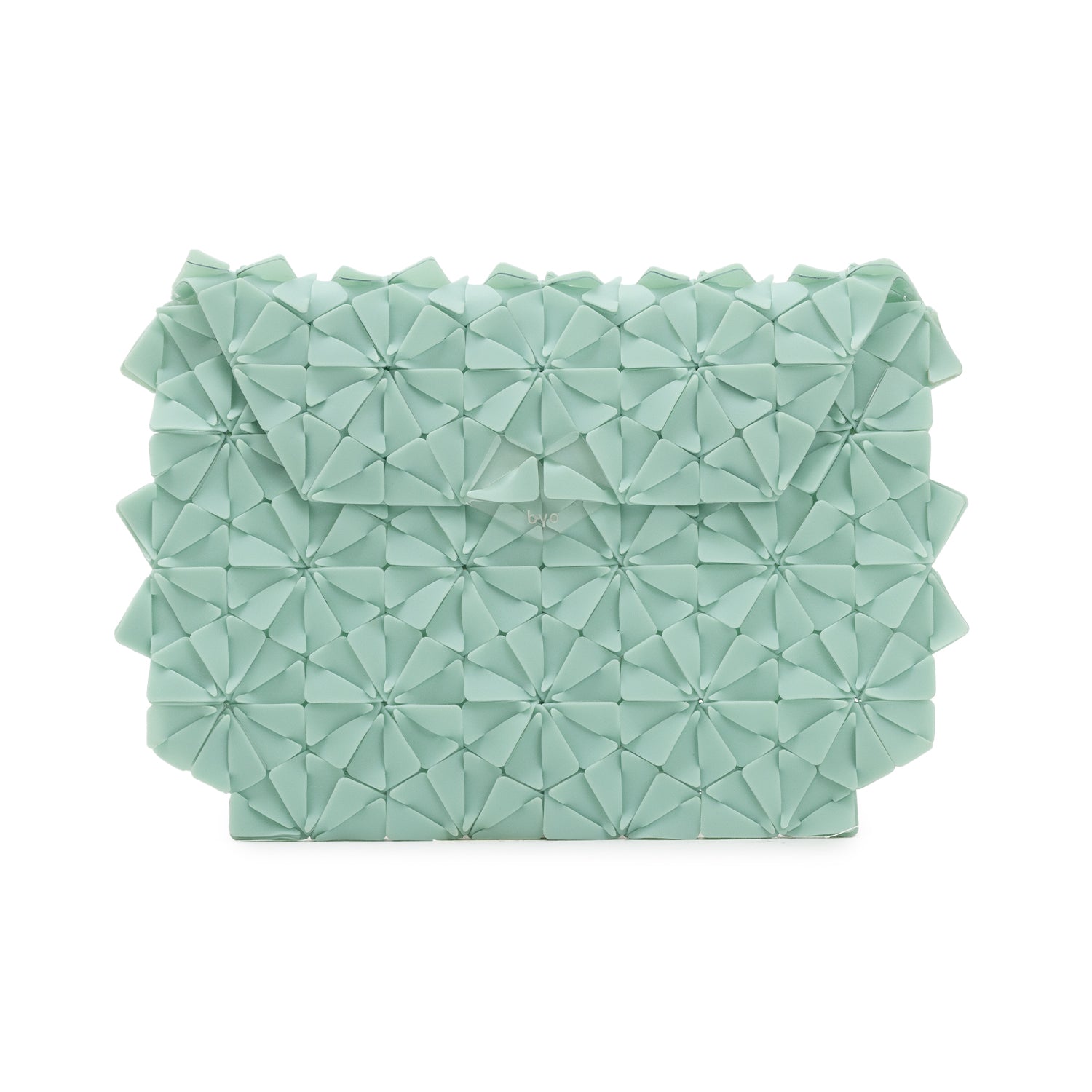 Machine-cut, Hand-woven geometric clutch held together by an interwoven right triangle shape. Soft and comfortable to hold 3D surface texture with rounded corners. Features a magnetic flap and a laser-cut acrylic label. Fits phones, keys, wallet, compact, or any of your everyday objects. D-rings are available for straps.