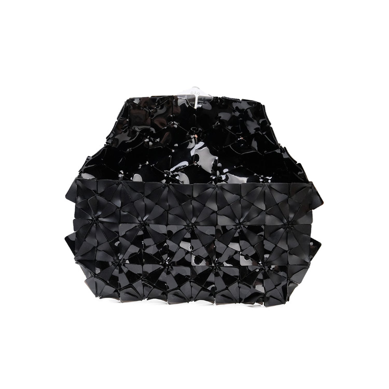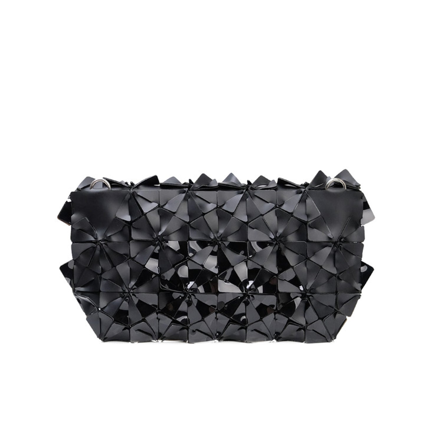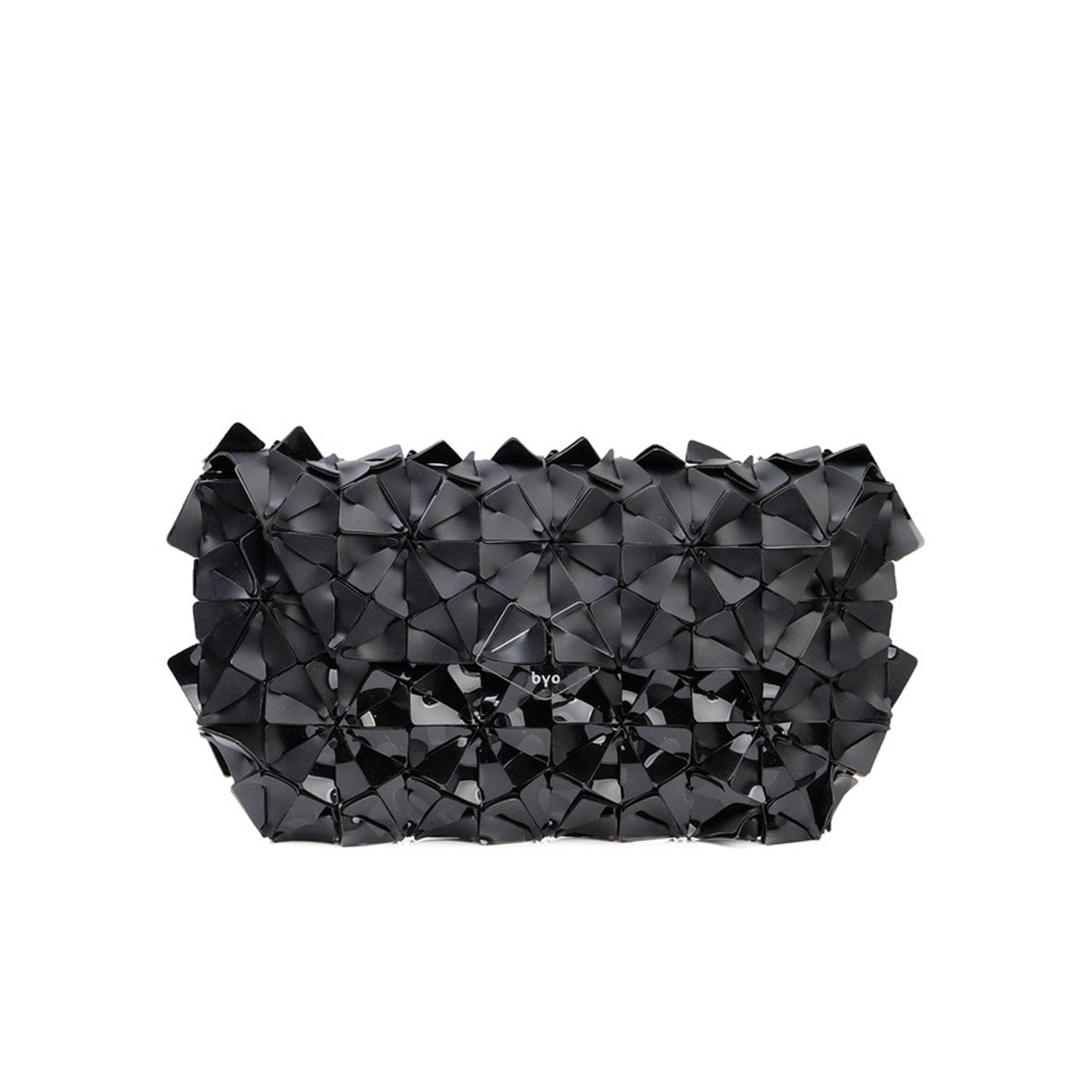 Machine-cut, Hand-woven geometric clutch held together by an interwoven right triangle shape. Soft and comfortable to hold 3D surface texture with rounded corners. Features a magnetic flap and a laser-cut acrylic label. Fits phones, keys, wallet, compact, or any of your everyday objects. D-rings are available for straps.
