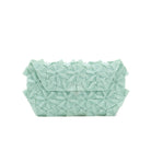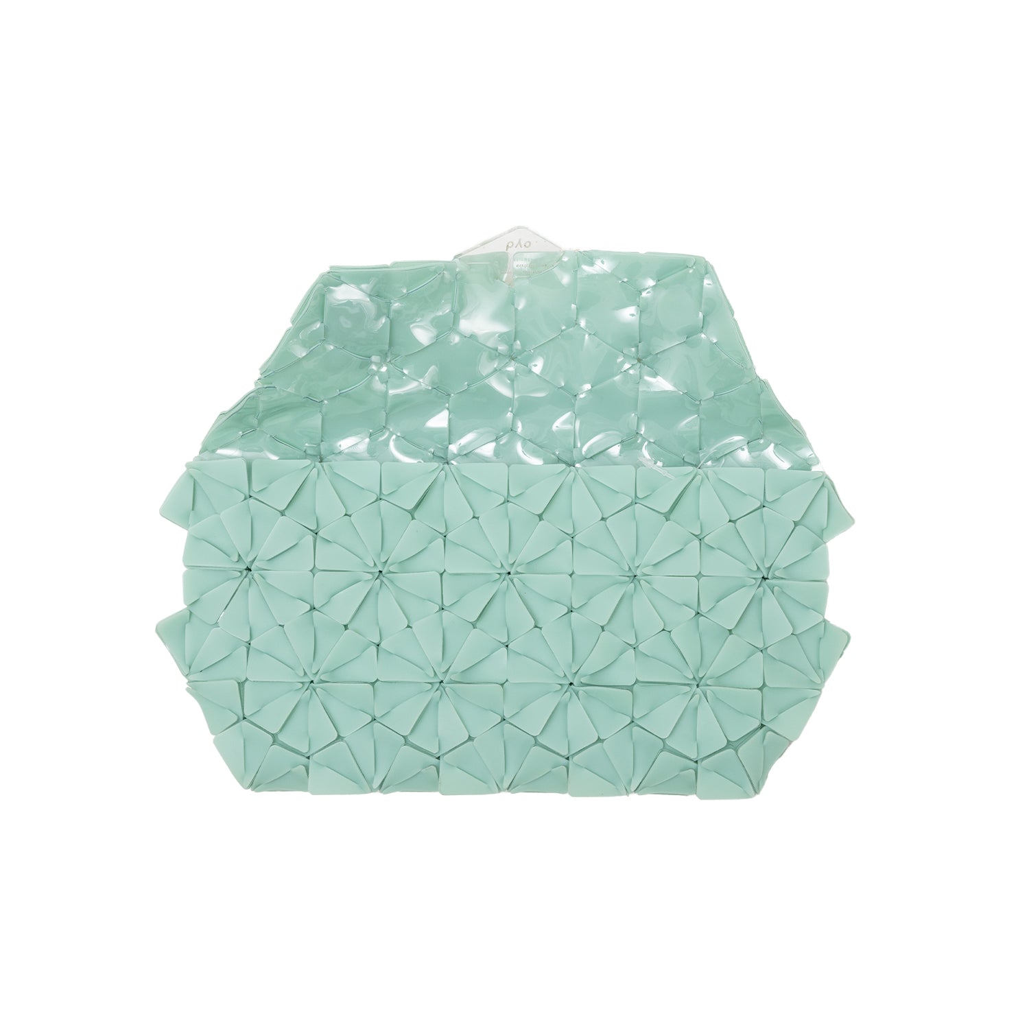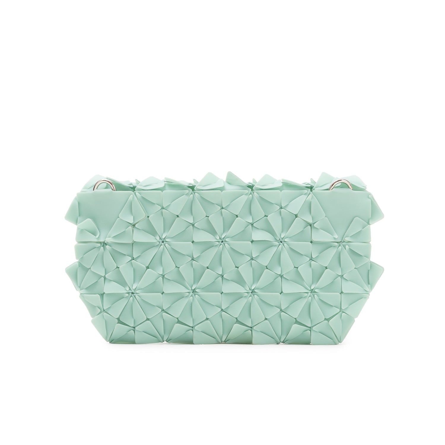 Machine-cut, Hand-woven geometric clutch held together by an interwoven right triangle shape. Soft and comfortable to hold 3D surface texture with rounded corners. Features a magnetic flap and a laser-cut acrylic label. Fits phones, keys, wallet, compact, or any of your everyday objects. D-rings are available for straps.