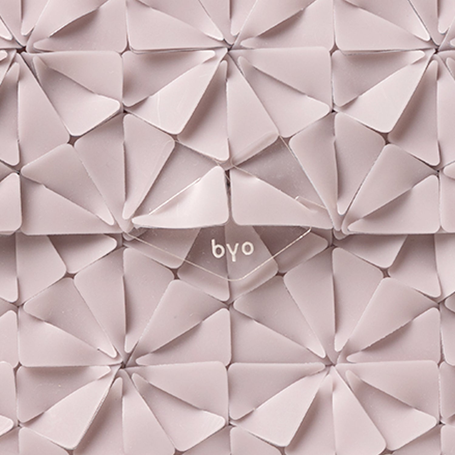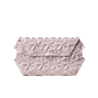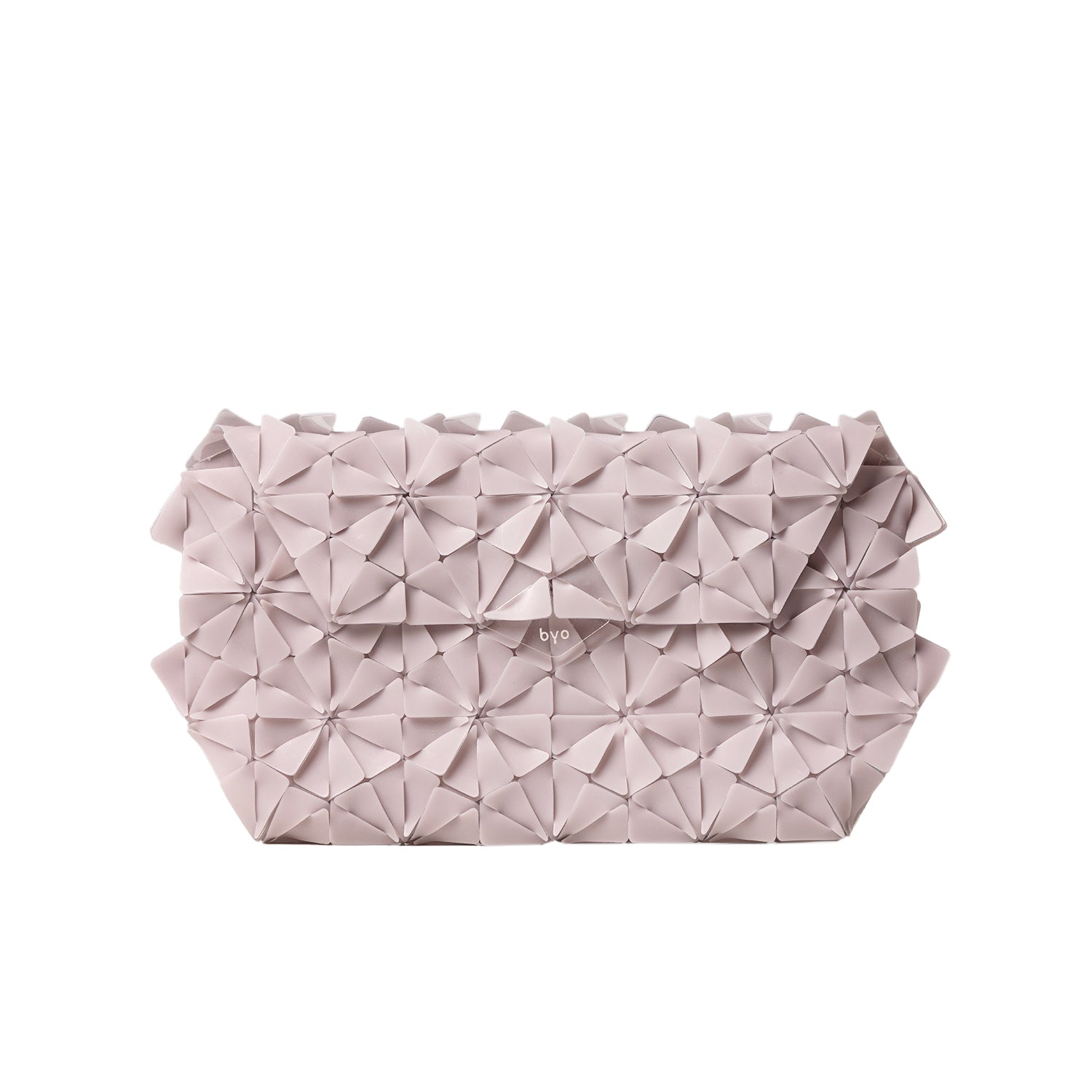 Machine-cut, Hand-woven geometric clutch held together by an interwoven right triangle shape. Soft and comfortable to hold 3D surface texture with rounded corners. Features a magnetic flap and a laser-cut acrylic label. Fits phones, keys, wallet, compact, or any of your everyday objects. D-rings are available for straps.