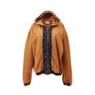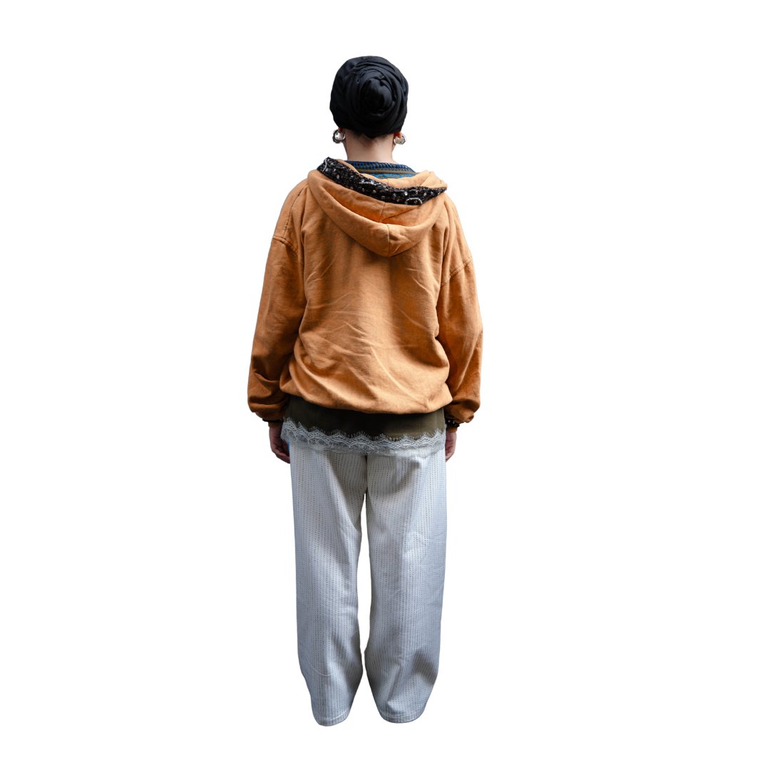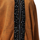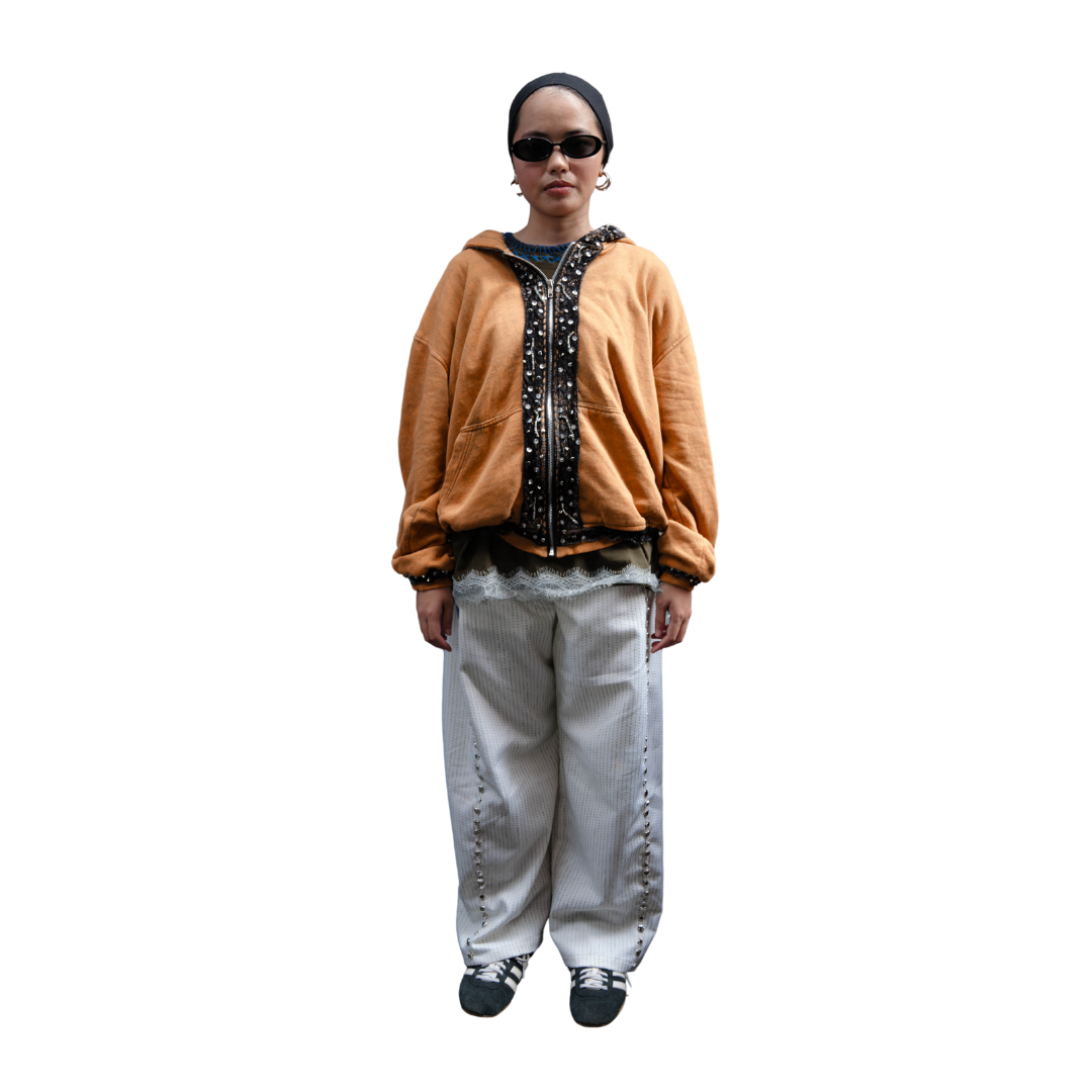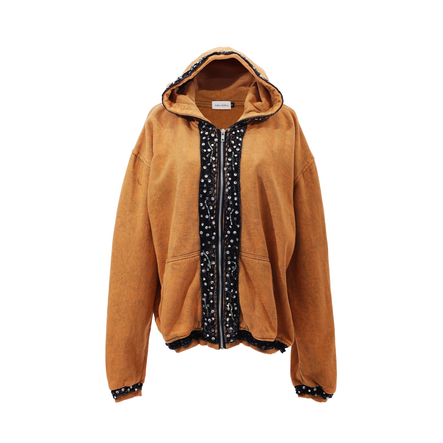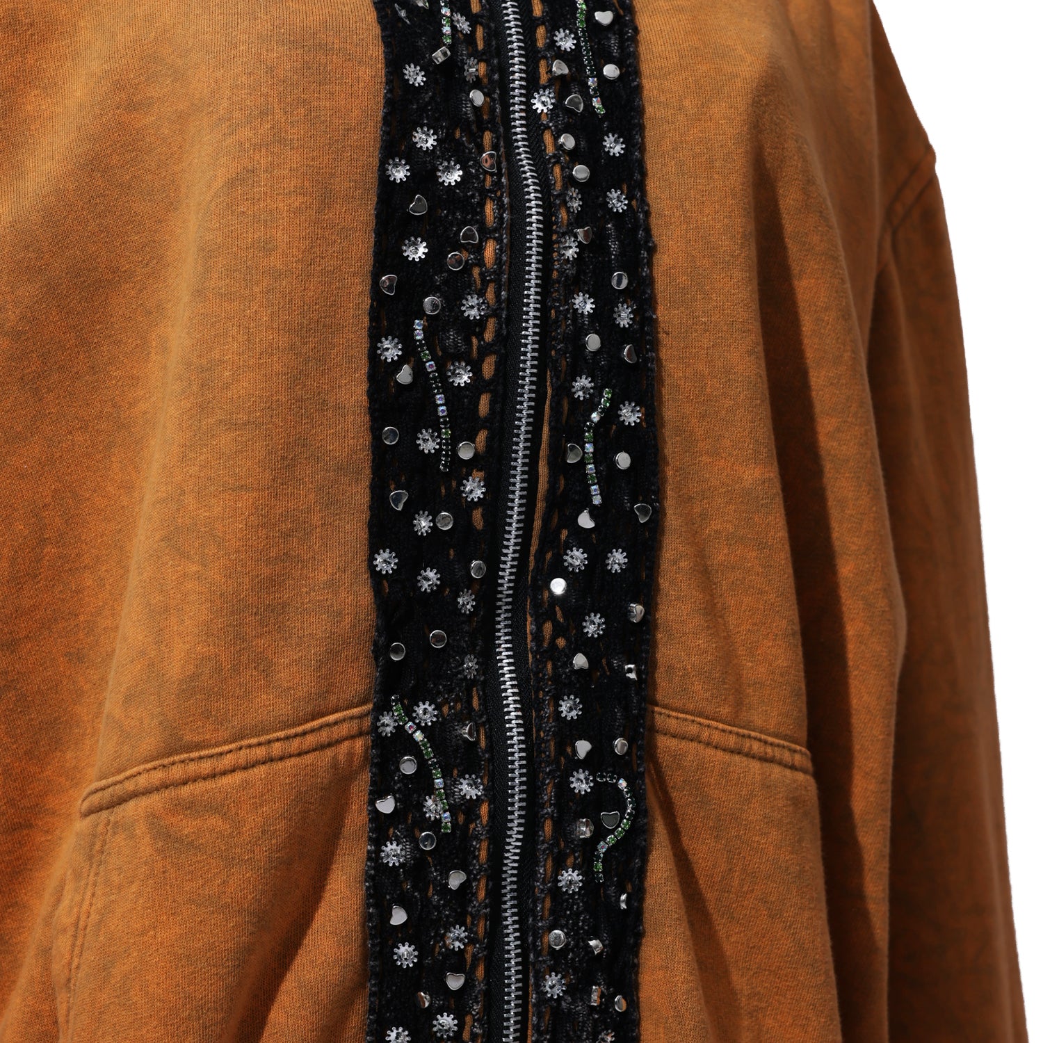 A zip up hoodie made from cotton, featuring a front lace and beads detail along the zip-line.